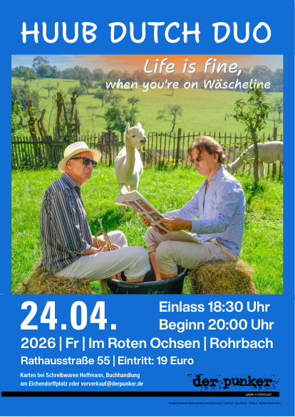 Und wo auch immer dieses kongeniale Duo in den letzten Jahren aufgetreten ist, war beste Stimmung garantiert! Denn was sie auf die Bühne bringen, ist eine mit Sprachwitz und leidenschaftlicher Spielfreude dargebotene fulminante Show, präsentiert vom quirligen Tausendsassa Huub Dutch unter anhaltender Beobachtung des unerschütterlichen Herrn Oettinger. Ein hochkarätiges Vergnügen mit toller Musik, jeder Menge Spaß und einem Speiskübel voll guter Laune. Macht nachhaltig glücklich.