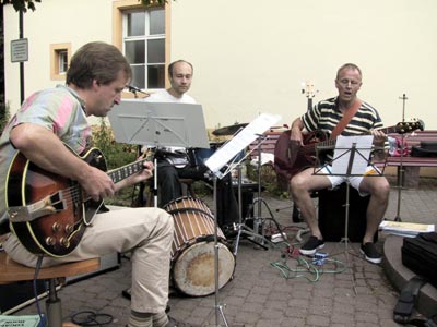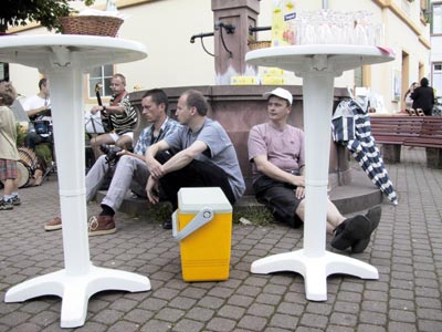 Untermalt wurde die Veranstaltung von einer dreiköpfigen Jazzband um Raphael Messmer, die als mit frühstückende Anwohner ganz spontan richtige Sonntagmorgenmusik am Brunnen zu Gehör brachten und gebührend dafür beklatscht wurden. Die punker- Aktiven schenkten Kaffee und Sekt aus und hielten an allen Ecken und Enden der langen Sitzreihen ein Schwätzchen. Sie freuten sich darüber nicht weniger als 150 Menschen zusammengebracht zu haben. In der Nachbarschaft des Frühstückplatzes informierten Aktive über die Situation der Familie Berischa, die zur Zeit im Kirchenasyl in der Lutherischen Kirche in Rohrbach lebt, und ein paar Anlieger schauten nur von ihren Fenstern aus beim bunten Treiben zu.