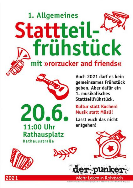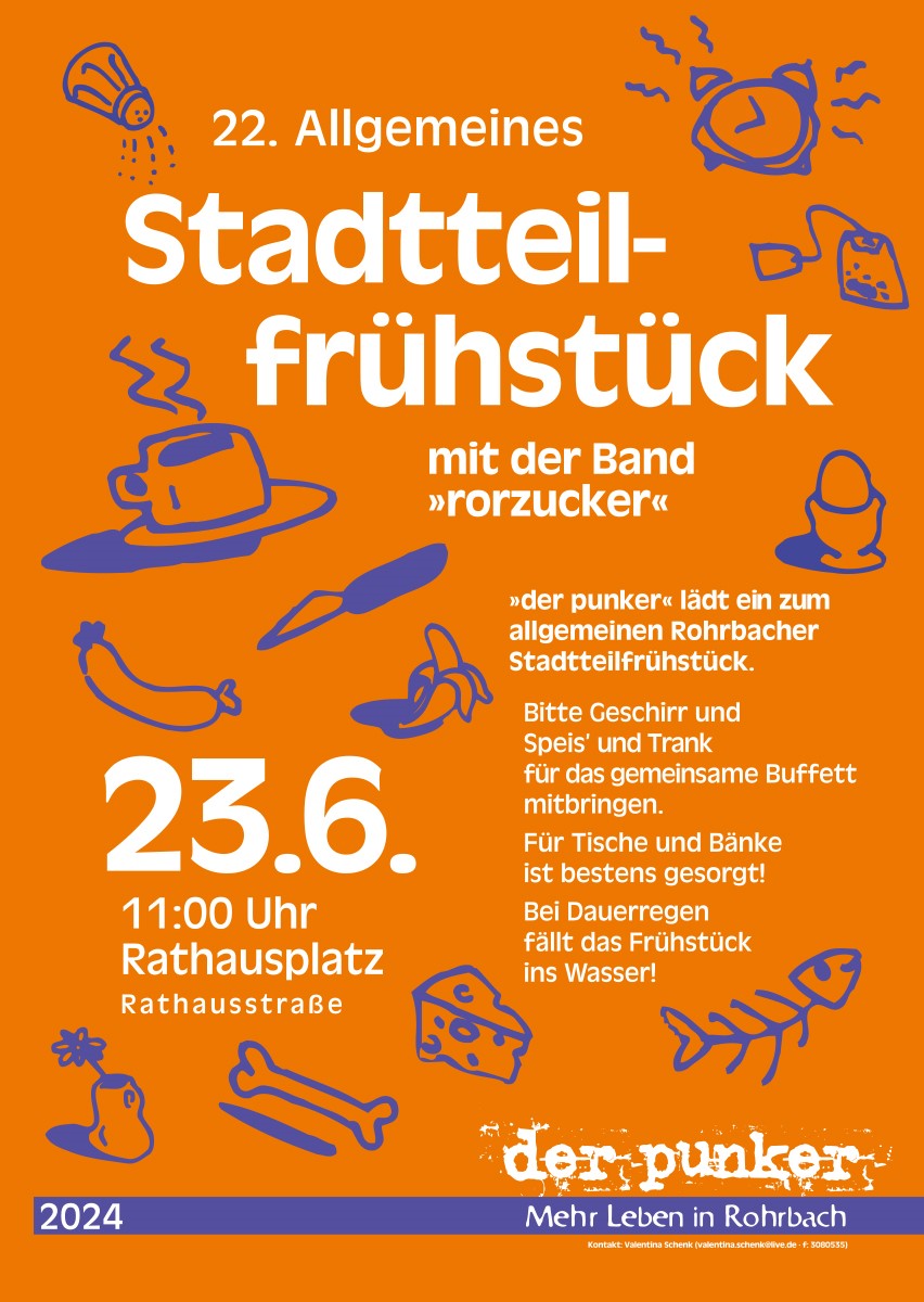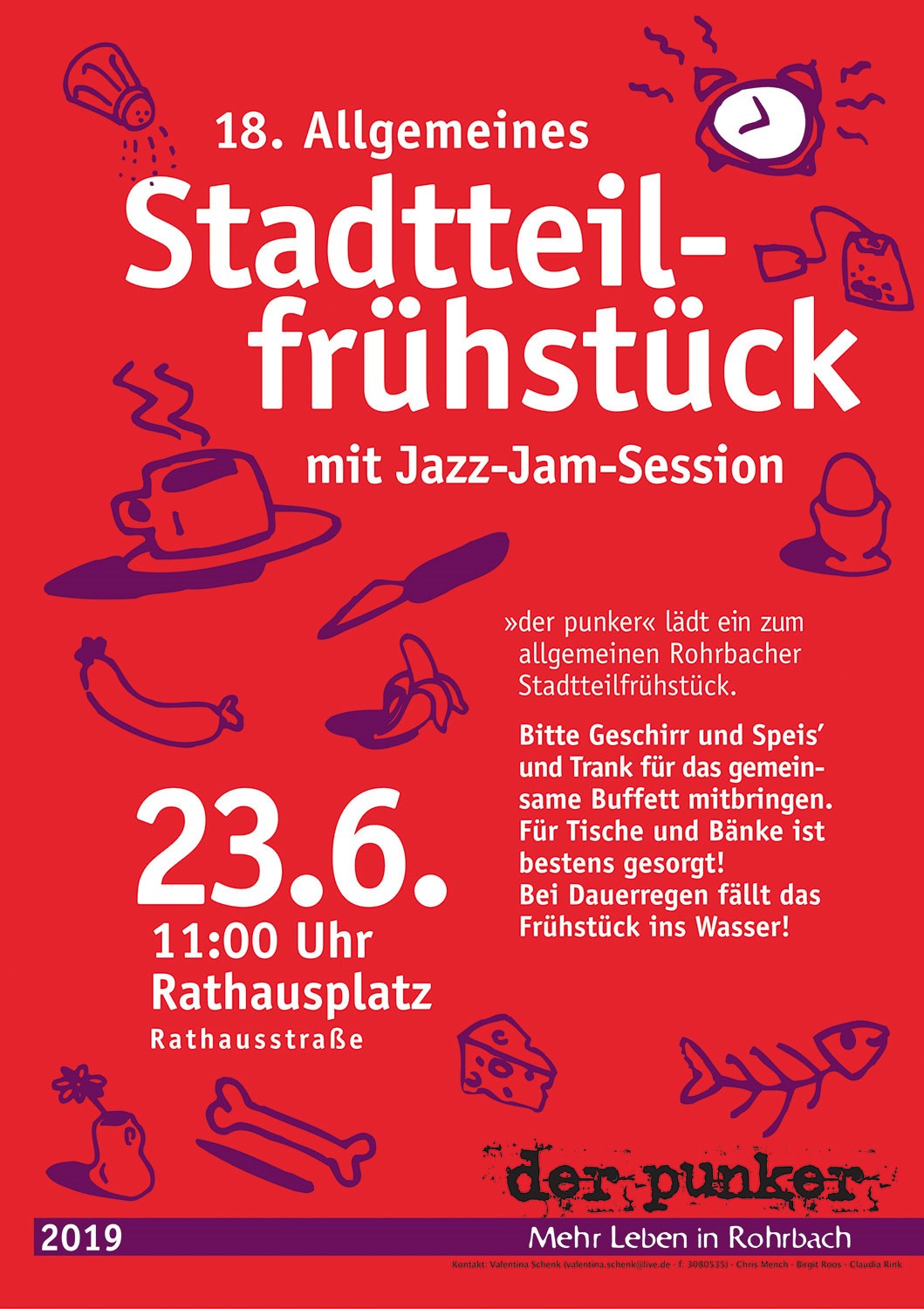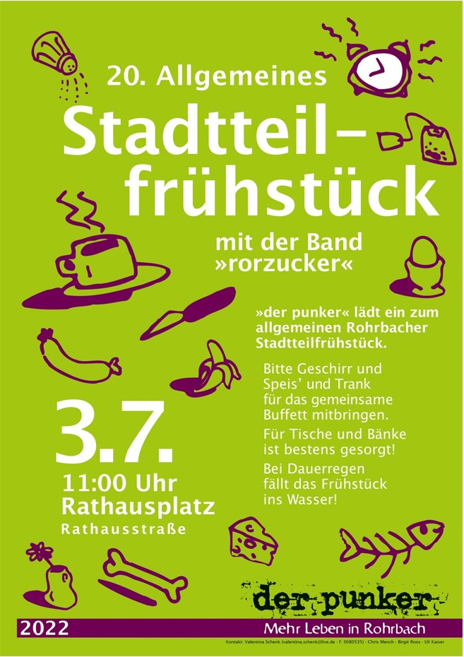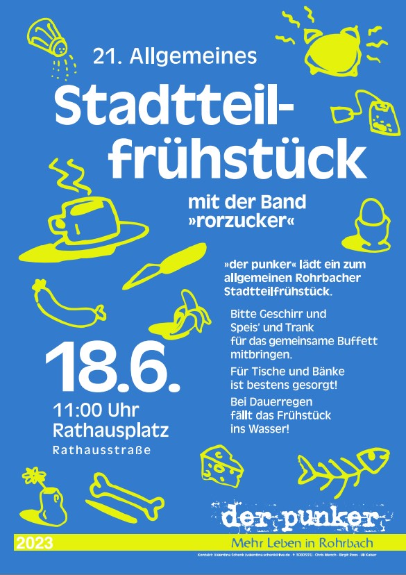 | Der punker stellt Tische und Bänke und bemüht sich um gutes Wetter, die Besucher bringen Speiß´und Trank mit: Das ist das Rohrbacher Stadtteilfrühstück. Nachdem gleich der erste Versuch 2001 ins Wasser fiel, wurde das Frühstück 2002 zum Beginn einer erfreulichen Reihe: | ||
