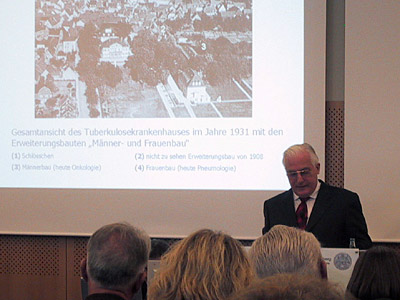 Dr. Joachim Haun verlas die Grußworte des erkrankten Aufsichtsratsvorsitzenden der Thorax, Dr. Winfried Haible. Er empfinde, so Haible, eine Ambivalenz, wenn er an Fraenkel denke: An die Leistungen, die er vollbrachte und den Undank, den er nach 1933 erntete. Fraenkel wurde auf dem Höchststand seines beruflichen Wirkens aus dem Beruf getrieben: 1928 zum ärztlichen Direktor der damaligen Tuberkuloseklinik berufen, hoch gelobt, wurde er bereits 1933 gekündigt, weil Jude war. Und das obwohl er eigentlich nach dem gültigen Arbeitsrecht unkündbar gewesen wäre. Es war eine einstimmige Entscheidung im Verwaltungsrat der LVA. Die Täter wurden nie zur Rechenschaft gezogen.