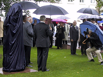 Vor der Enthüllung der von Helmut Heinze gestalteten Büste Fraenkels führte Dr. Heiner Protzmann, ehemaliger Direktor der Skulpturensammlung staatlichen Kunstsammlungen Dresden, in das Werk ein. Reglos klar wie aus der Zeit des Perikles sei die Büste, spiegele eine asketische Enthaltung. Eine Beschreibung, die in ziemlichem Kontrast zur Person des Künstlers stand. Dieser meine zunächst, er habe eigentlich gar nicht reden wollen, "das Ding steht hier und fertig." Doch dann sprach er doch über "diese lustige Wiese" und den Regen und sein Werk.