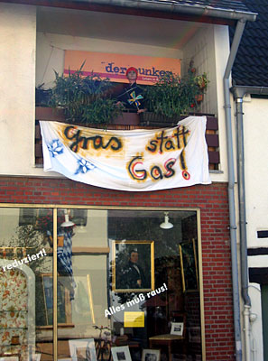 Einstweilen bleibt uns nur ein Photo, das den kerwepunker zeigt. Dieser hatte diesmal auf das „Rettet das Käthchen“ verzichtet, nachdem er die Ausführungen von Ludwig Schmidt-Herb zur weiblichen Seite der Kerwe gelesen hatte. Stattdessen forderte der kerwepunker „Gras statt Gas!“.