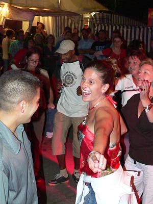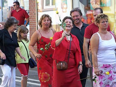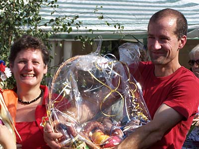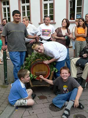 Schließlich schlug die Kerweguerilla des punker noch ein weiteres Mal zu. Zur größten Überraschung zunächst unserer selbst, dann des Stadtteilvereins, beschlossen wir kurzfristig und unter dem Einfluss der einen oder anderen Kiste Rieslingsekt vom Dachsbuckel uns am „Kälblestanz” zu beteiligen. Der Stadtteilverein hatte allen Vereinen angeboten, dazu jeweils bis zu zwei Paare anzumelden. Was wir auch taten und prompt den ersten Preis in Form eines bereits verarbeiteten Kälbchens errangen. Wobei „errangen” natürlich nicht wörtlich gemeint ist, auch wenn Neider dem punker ungerechter Weise nachsagen, seine Tanzpaare hätten sich z.T. recht konsequent in den Besitz der Tanzstäbe gebracht.