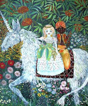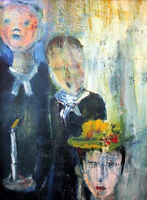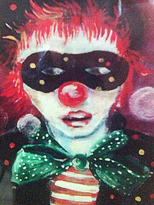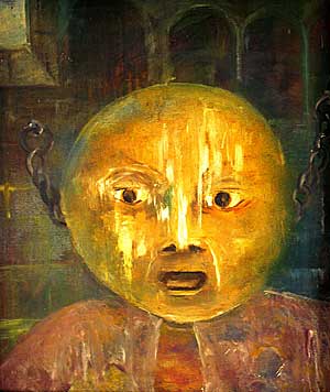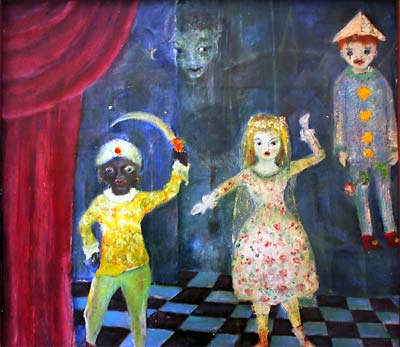 Viel stärker in der Ausstellung vertreten waren expressionistisch anmutende Bilder mit Fabelwesen und immer wieder Kindern. Da waren der Sarotti-Mohr und die Prinzessin lieblich auf dem Einhorn reitend oder auf einer Bühne, bedrohlich auf den Betrachter einstürmend. Ein Clownkind baumelt wie erhängt im Hintergrund eine Teufelsfratze oder ein Faun beäugt es. Kinderträume in denen das Böse seine Dominanz verloren hat, aber nicht verschwunden ist.