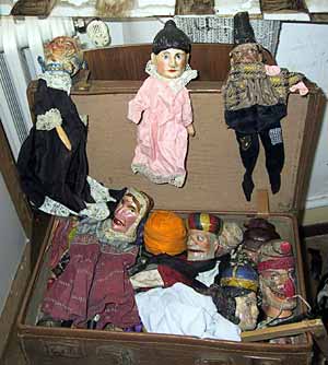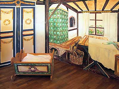 Größere Menschen mussten sich zunächst unter der weiß-blauen Fahne hindurch ducken. Im Saal oben erwartete mich das Erwartete: Eine Fülle von Bildern, theaterkulissenartig umgrenzt von einem rustikalem Bauernstück.