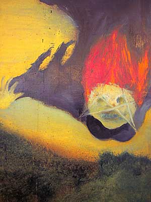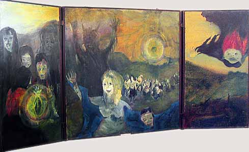 Bei diesem Bild der katholischen Kirche assoziiert man unweigerlich die Apokalypse. Und so war das wohl auch gemeint. Renate Hammerstein, die Schwester des Künstlers, beschrieb den Hintergrund vor dem das Triptychon entstand. Motz’ Vater war katholisch, heiratete jedoch eine evangelische Frau und erzog auch seine Kinder evangelisch. Als er starb weigerte sich der damalige katholische Pfarrer Rohrbachs, ihn zu beerdigen. Motz’ Vater wurde schließlich evangelisch beerdigt. Die Begebenheit hat den jungen Rainer Motz stark geprägt. Zeit Lebens blieb er zwar Christ, aber auch Antikatholik.