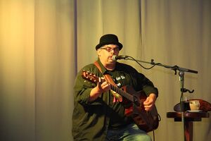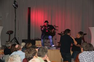 Nach der Begrüßung durch Birgit Roos trat Olli Roth um kurz nach 20 Uhr in Aktion, es sollte ein langer und mitreißender Rockabend werden. Olli Roth ist ein Künstler aus der Region mit inzwischen 40-jähriger Präsenz im Rockgeschäft. Schon in Kindesjahren wurde sein Talent deutlich und als er mit 15 Jahren der Mutter eröffnete, Berufsmusiker werden zu wollen, war das - wie Olli selbst sagte - für seine Mutter der „Supergau“. Er realisierte seinen Traum trotzdem und spielte inzwischen als Vorgruppe bei namhaften Größen des Rockgeschäfts wie z.B. Barclay James Harvest, Hooters oder Manfred Mann, mit dem er auch persönlich befreundet ist. Das besondere an Olli Roth ist, dass er oft ganz alleine auf der Bühne steht, dabei aber trotzdem die Instrumentalität einer sehr gut besetzten Rockband akustisch umsetzt. Dieses Wunder führte Olli Roth heute Abend dem Rohrbacher Publikum vor. Zwischen weltbekannten Stücken wie beispielsweise „Sweet home Alabama“, der „Hymn“ von B.C.H. oder dem frühzeitigen Wunschtitel aus dem Publikum „House of the rising sun“, unterhielt Olli Roth sein Publikum mit auflockernden Histörchen, wie z.B. dem Hinweis, dass er einige Jahre in Rohrbach gelebt hatte.