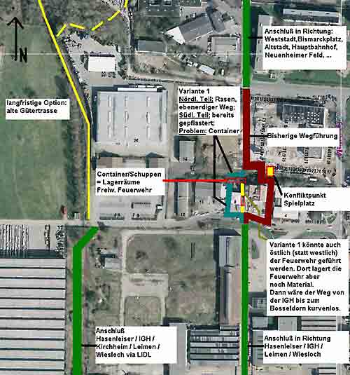 - Radwegzugang über das Gelände der frw. Feuerwehr wie oben (der Geräteschuppen müßte dafür versetzt werden). Dann über den Grünstreifen am Bürogebäude West links und hinter dem Bürogebäude West ins Bosseldorn. Kosten: ca. 25.000 Euro